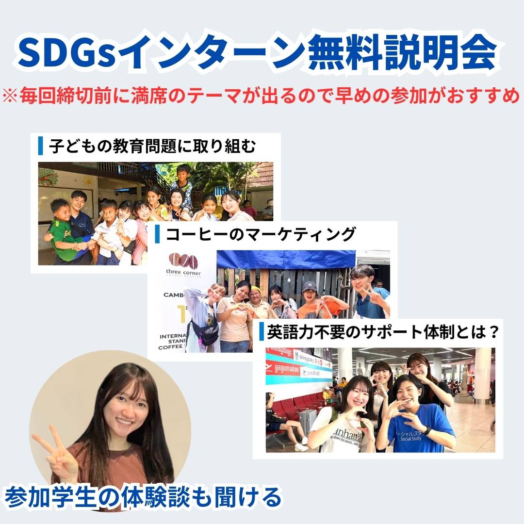 オンライン無料説明会では、たった30分間で、SDGsインターンシップのテーマごとの詳細や、カンボジアのこと、SDGsの実践と就活に生きる経験ができる理由がわかる!