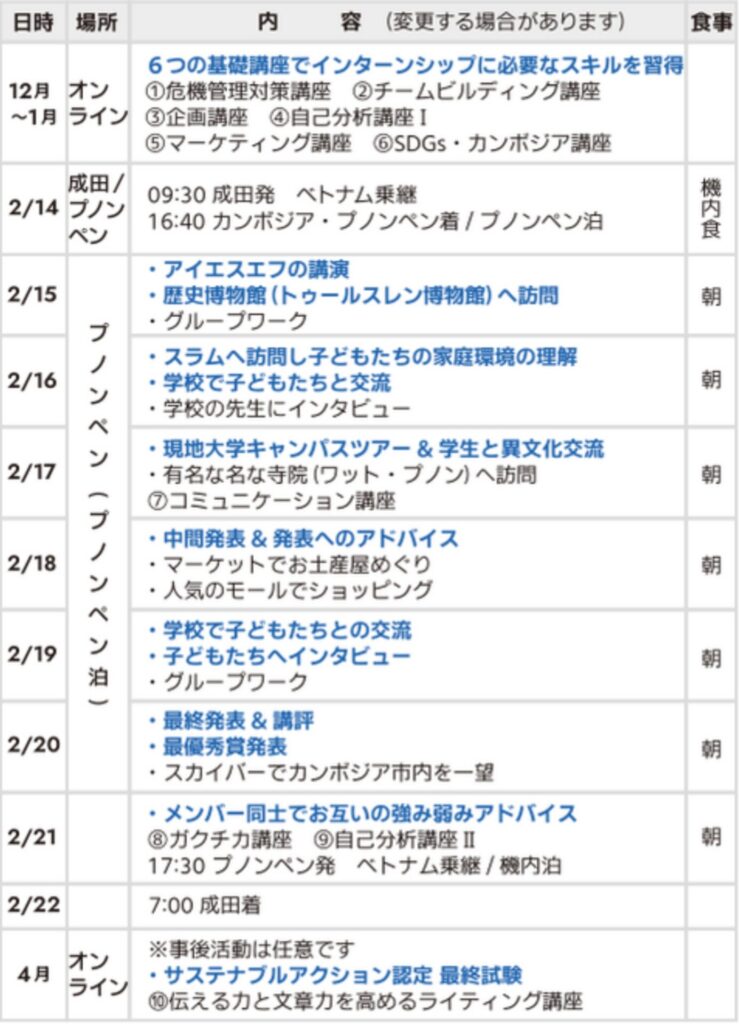 | 期間 | カンボジア7泊9日+オンラインスクール6日(事後学習3日は任意) 【現地渡航日】 2/14(土)〜2/22(日) |