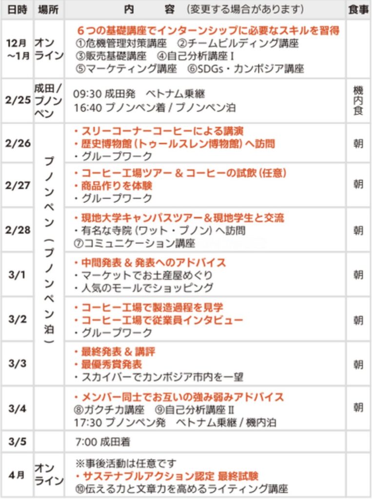| 期間 | カンボジア7泊9日+オンラインスクール6日(事後学習3日は任意) 【現地渡航日】 2/25(水)〜3/5(木) |