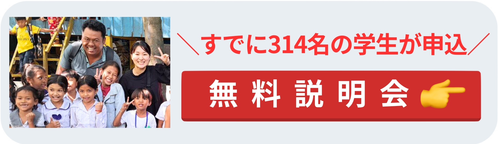 オンライン無料説明会では、SDGsインターンシップのテーマごとの詳細や、カンボジアのこと、SDGsの実践と就活に生きる経験ができる理由がわかる!たった30分間なので気軽に参加できる✨