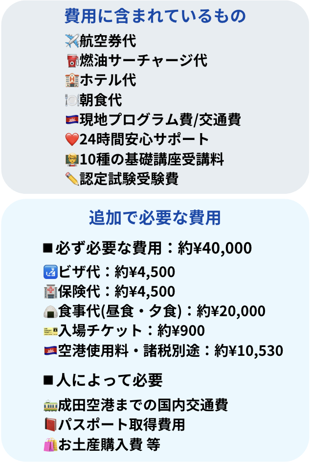 | 内容 | 🔰英語力不要で初海外におすすめの理由 ✅プログラム内容と費用 👩🎓参加学生のリアルな体験談 🇰🇭カンボジアでの生活(食事・ホテル・観光) |