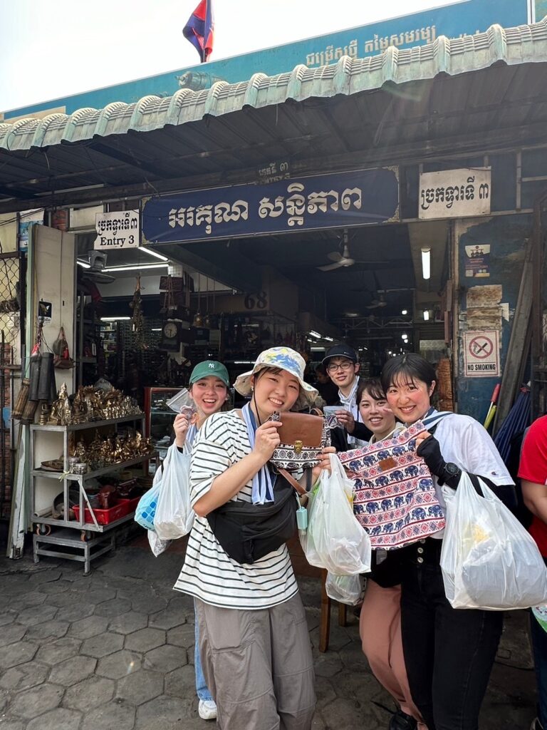 そして、カンボジアではグループワークだけでなく、マーケットに行ったり、スーパーに行ったり買い物をする機会もあります。お会計、注文では私のぎこちない英語を理解して、簡単な単語で返してくれたり、間違った使い方をしていたら正しい言い方を教えてくれたり、こんな意味もあるよと教えてくれる店員さんもいました。