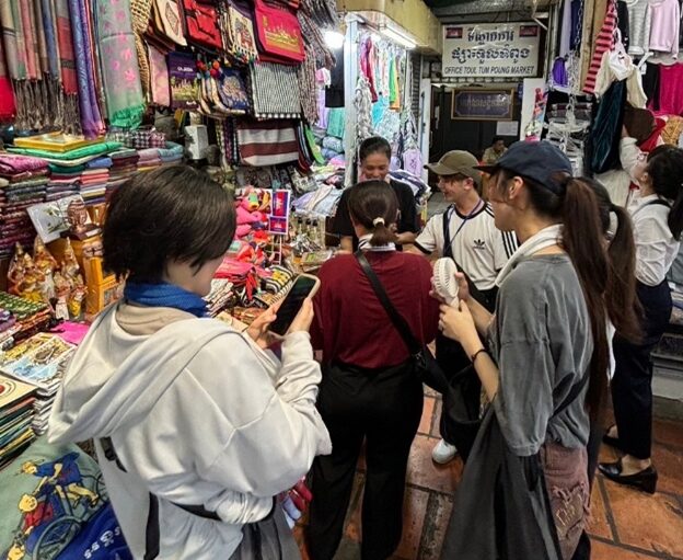 マーケットでは、グループで買い物をしますが、商品の値段が書かれていないため、自分たちで値段交渉をします。到着する前に買い物で使えるクメール語を