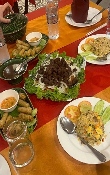 朝食はホテルのビュッフェで自分の好みにあった料理をとることができました!ちなみにドラゴンフルーツとパイナップルはみずみずしくて美味しかったのでほとんど毎日食べていました!!特にカンボジア料理は食べたことも見たこともなく、全てが初めてだからこそ様々な料理にチャレンジしました!異国の文化に触れられている感じがして今日はどんな味の料理だろう??と毎日楽しんでいました!
