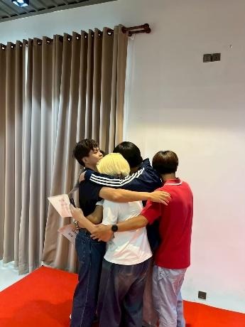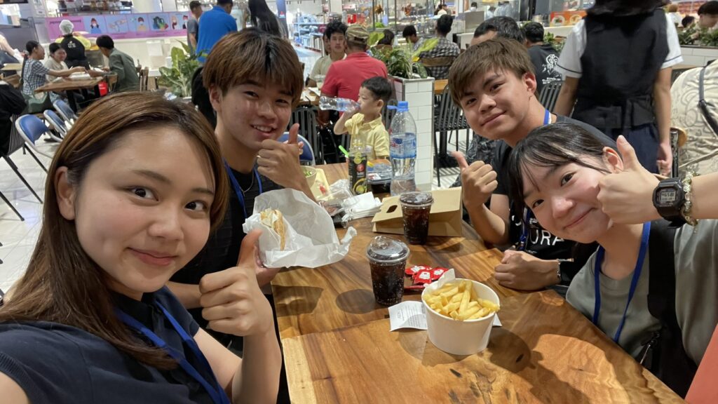 そして私が最も驚いたことは、イオンモールの規模に加えた街の絶景でした。プノンペン市街地には実は大きなイオンモールがあり、中に入ると日本にあるイオンモールそのものの雰囲気が感じられました。Day3とDay5にはこのイオンモールで同部屋との4,5人グループや各発表グループから1人ずつで構成された5,6人グループでお土産や食事を共にしました。(写真④)Day6にはスカイバーでプノンペン最後の夜を楽しみましたが、そこでみた夜景がまた印象深いものになりました。(写真⑤)この夜景をみていたら6日間の思い出が走馬灯のように思い出してきて涙腺がとてもゆるくなりました。そして迎えた現地最終日。会議室で最後の集まりを済ませると、私以外の男子たちが突然泣き出して輪になったり、その輪に女子が集合してきたりするサプライズもありながらあっという間の1週間が終わりました。(写真⑥)