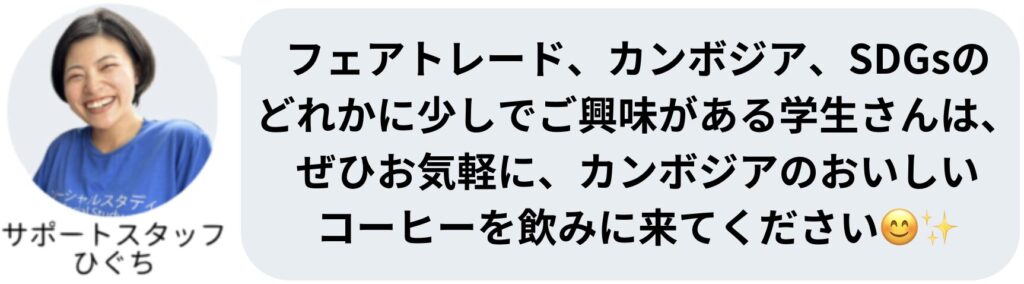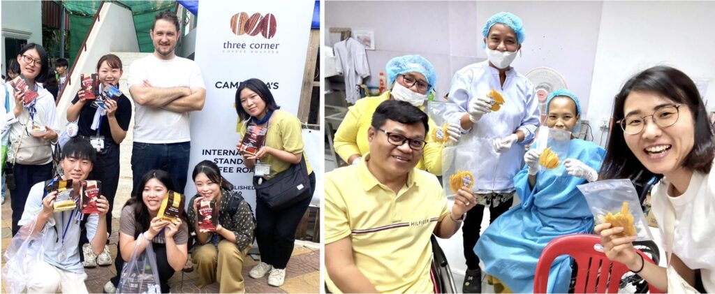カンボジアの貧困解決につながるフェアトレードコーヒーや、障がい者雇用につながるドライマンゴーを無料で楽しむことができる✨