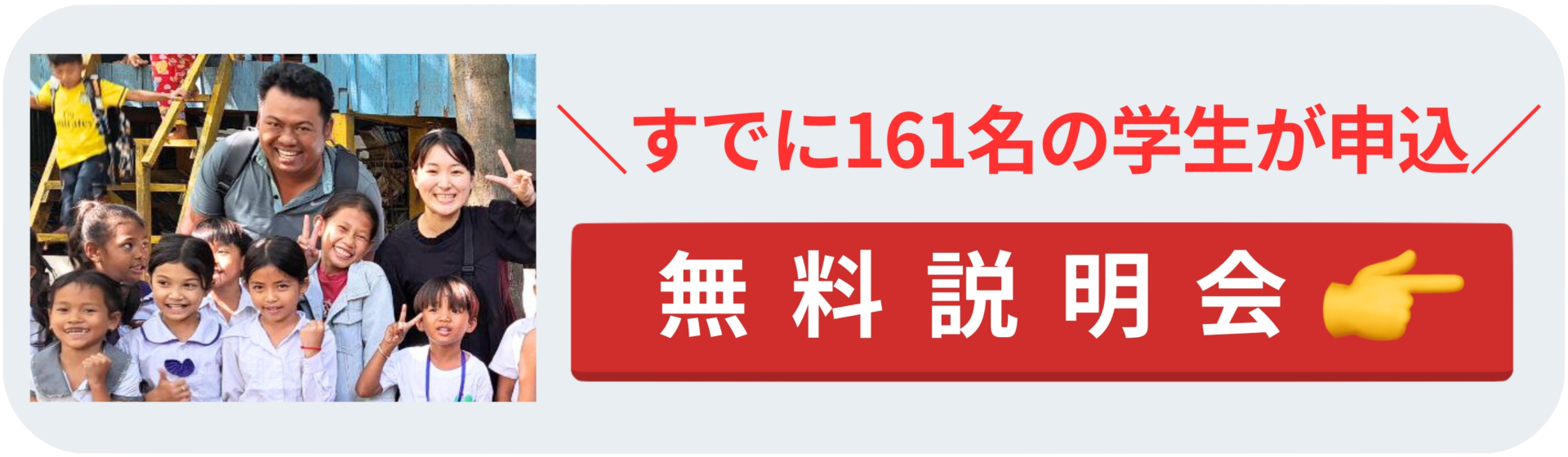 内容 | ・SDGsインターンの詳細と費用 ・参加学生の体験談 ・英語力不要のサポート体制とは? ・カンボジアでの食事や宿泊の紹介 |