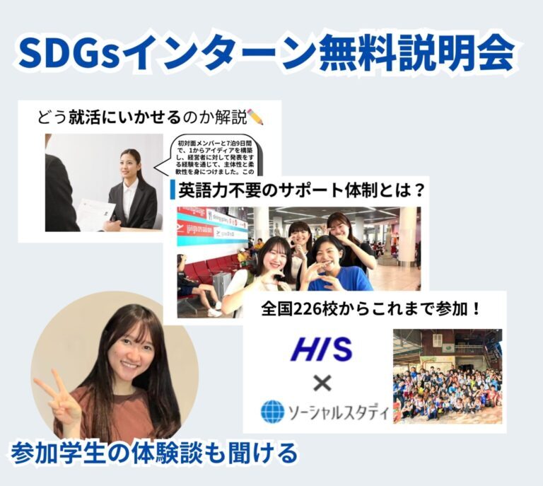 オンライン無料説明会では、インターンシップのテーマごとの詳細や、現地のこと、就活にいかせる経験ができる理由がわかる!同じ大学の先輩の体験談も聞ける✨